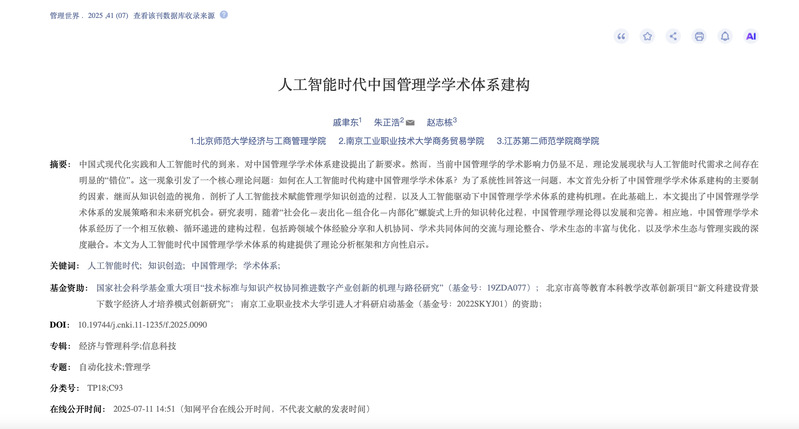 近日,爱体育手机在线登陆入口商务贸易学院朱正浩教授与北京师范大学戚聿东教授、江苏第二师范学院赵志栋博士合作论文“人工智能时代中国管理学学术体系建构”,刊发于管理学顶刊《管理世界》2025年第7期,朱正浩教授为本文通讯作者,这是爱体育手机在线登陆入口首次以通讯作者单位在管理学顶刊《管理世界》发文,论文受到爱体育手机在线登陆入口引进人才科研启动基金(基金号:2022SKYJ01)的资助。