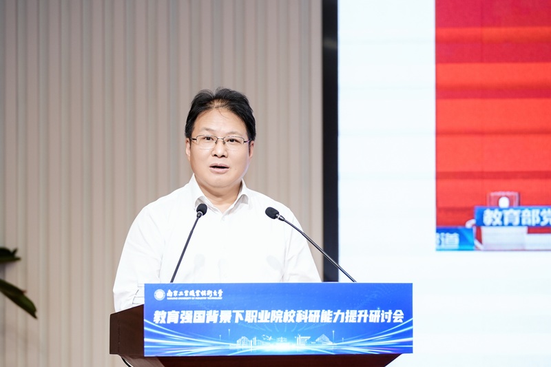 何学军作《聚焦区域发展战略,有组织开展职教科研工作》主旨报告。他深刻阐释了科技与产业融合创新的新趋势,重点分享了学校在营造科研生态、深化机制改革、加强协同创新、推动计划实施四个方面的探索实践。
