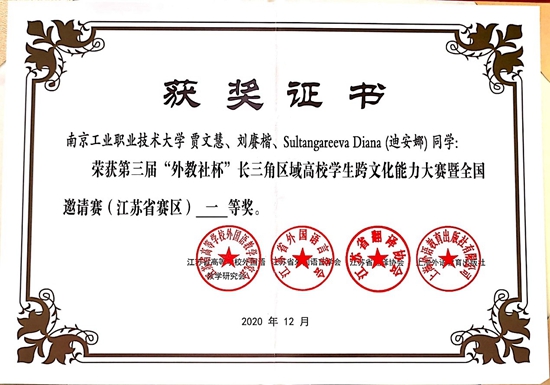 12月8日,第三届“外教社杯”长三角区域高校学生跨文化能力大赛比赛省赛评审工作在东南大学九龙湖校区举行,公共基础课部和国际教育学院选派了刘赓楷(2019级机械制造与自动化专业)、贾文慧(2020级国际贸易专业)和Sultangareeva Diana迪安娜(留(2019秋)国际贸易专业)等三名选手组成比赛团队,近日大赛结果公布并颁发证书,爱体育手机在线登陆入口学生团队喜获大赛一等奖。公共基础课部大学英语教研室张卉和国际教育学院孙世娟两位老师荣获“优秀指导教师”称号。