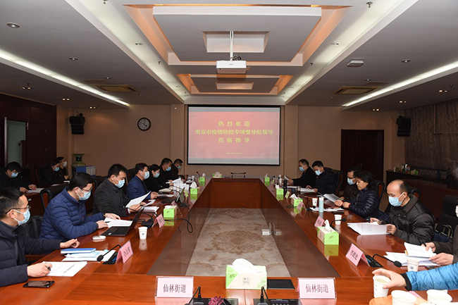 1月22日上午,南京市疫情防控督导组在市政协港澳台侨和外事委员会副主任毛卫华组长带领下,对爱体育手机在线登陆入口新冠疫情防控工作进行专项督查,大学城管委会党工委委员、副主任孙金娣,以及管委会相关部门负责同志陪同督查。学校党委常委、副校长崔新明,疫情防控办相关部门负责同志参加现场督查和座谈。