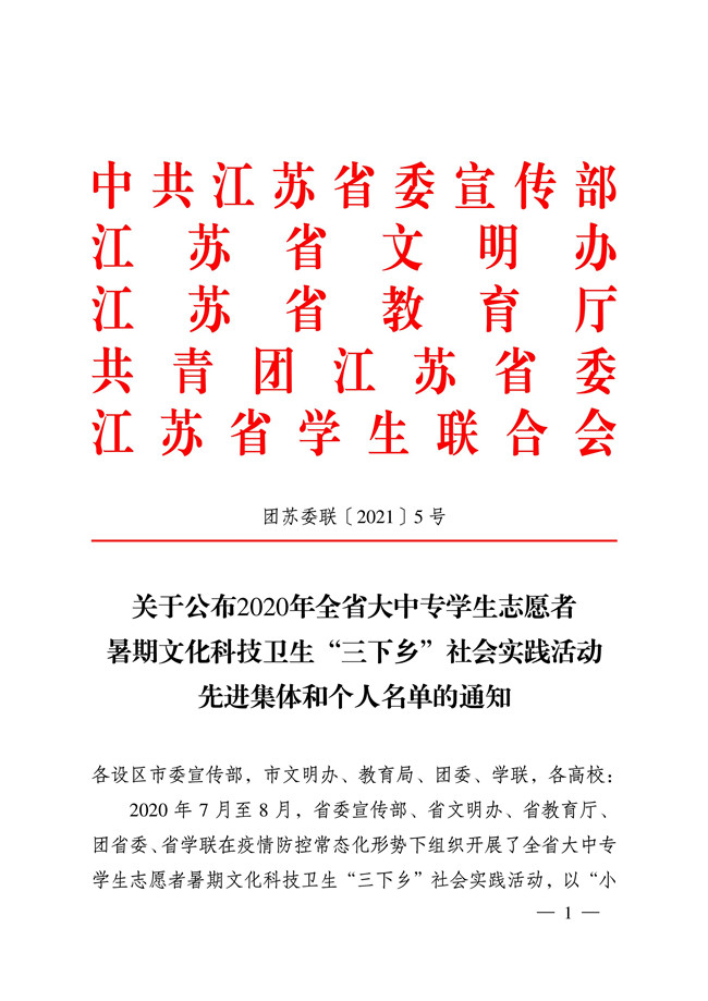 近日,中共江苏省委宣传部、江苏省文明办、江苏省教育厅、共青团江苏省委和江苏省学生联合会联合下发了《关于公布2020年全省大中专学生志愿者暑期文化科技卫生“三下乡”社会实践活动先进集体和个人名单的通知》,爱体育手机在线登陆入口在该活动中获多项荣誉。