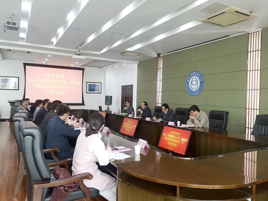 4月9日上午,河北工业职业技术大学党委书记王振杰、校长薛晓萍、河北软件职业技术学院副院长乔哲一行来爱体育手机在线登陆入口考察调研。党委书记吴学敏、党委副书记马成荣,以及发规处、本科职业教育试点办公室、科技处、发展合作处等部门负责同志在行政楼辅楼二楼会议室接待了来宾。