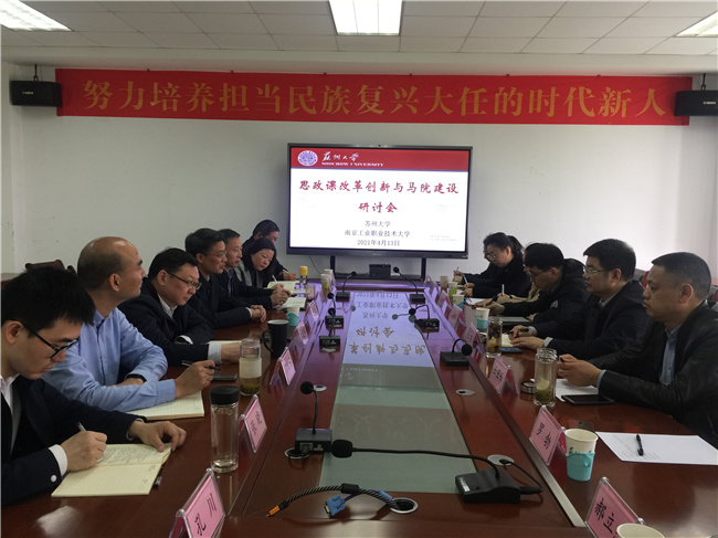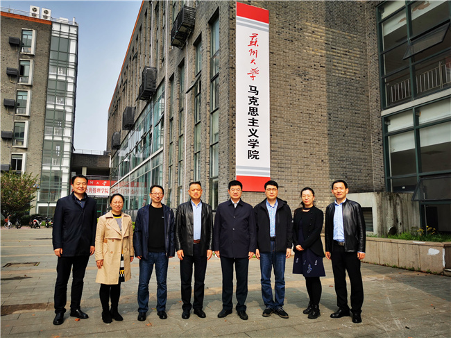 4月13日,校党委副书记王伟带领爱体育手机在线登陆入口马克思主义学院负责人和教研室主任赴苏州大学马克思主义学院围绕“十四五”规划的编制、思政课教学改革创新和教研室的工作机制等开展学习调研。苏州大学党委副书记邓敏、马克思主义学院党委书记陈建军、院长田芝健、副院长茆汉成和部分教研室主任出席会议,会议开始前,在苏大独墅湖校区二期1103室听了教授、博士生导师杨渝玲的一场《马克思主义基本原理》示范课。